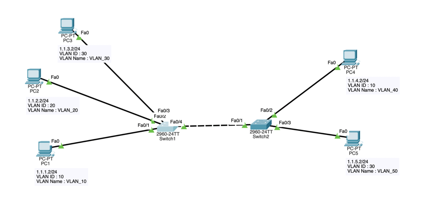 그 이유는 스위치와 스위치를 연결한 VLAN ID가 다르기 때문이다.