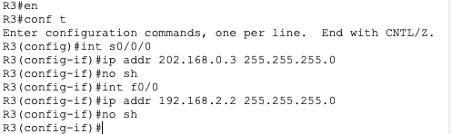 f0/0과 s0/0/0 , s0/0/1 의 IP와 서브넷 마스크를 할당한뒤 전원을 켜줍니다