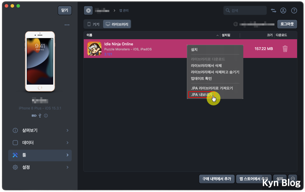 2. 라이브러리 탭으로 이동한 후 추출하고자 하는 항목에 ". IPA 내보내기"를 시도한다.
