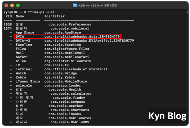 4. frida 명령어 입력 후 추출하고자 하는 앱의 Identifier를 복사해 준다.