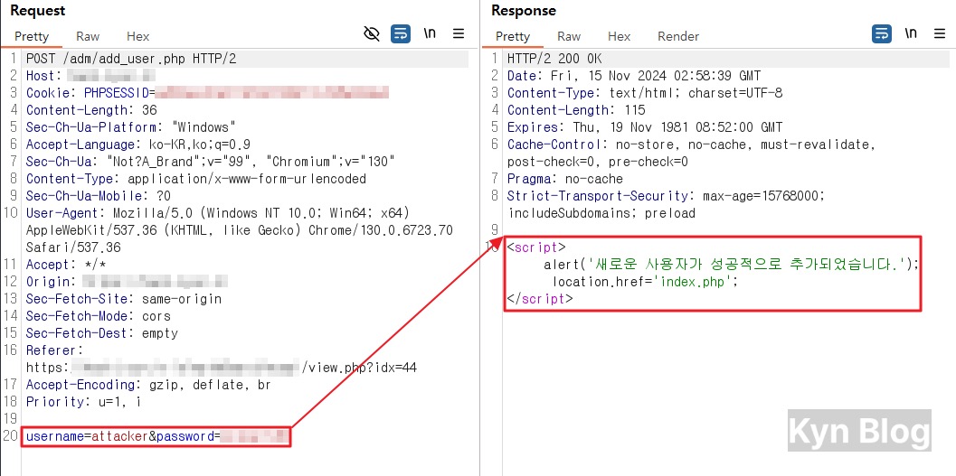 Step 4. 게시글에 삽입된 스크립트가 실행되면서 관리자 세션으로 새로운 관리자 계정 등록을 요청함