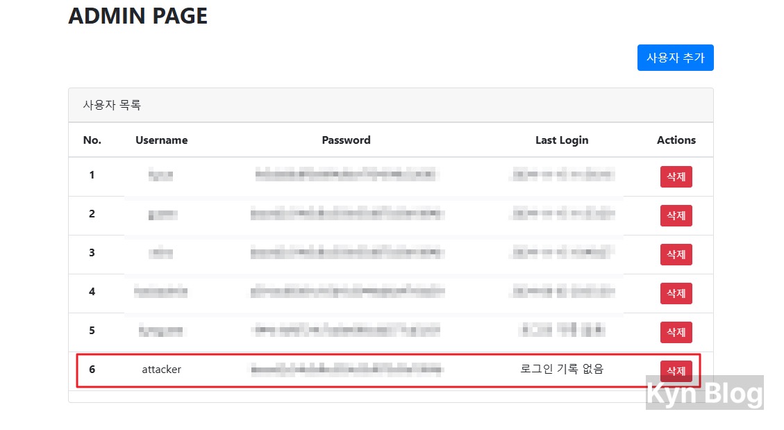 Step 5. 관리자 페이지에서 사용자 목록을 확인했을 때 "attacker" 계정이 추가된 것을 확인