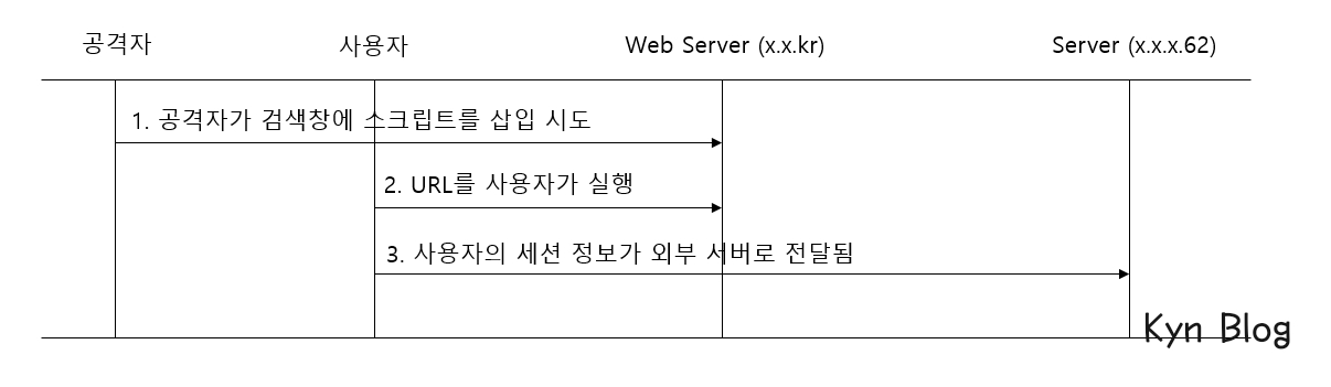 공격자가 검색창에 악성 스크립트를 삽입하고, 사용자가 검색 URL을 실행할 때 인증 정보가 탈취되는 시나리오입니다.