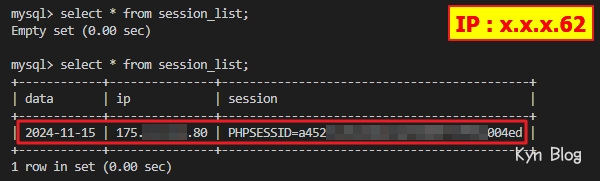 Step 5. 사용자 세션 정보가 "IP x.x.x.62" 데이터베이스에 저장되어 있는 것을 확인할 수 있음