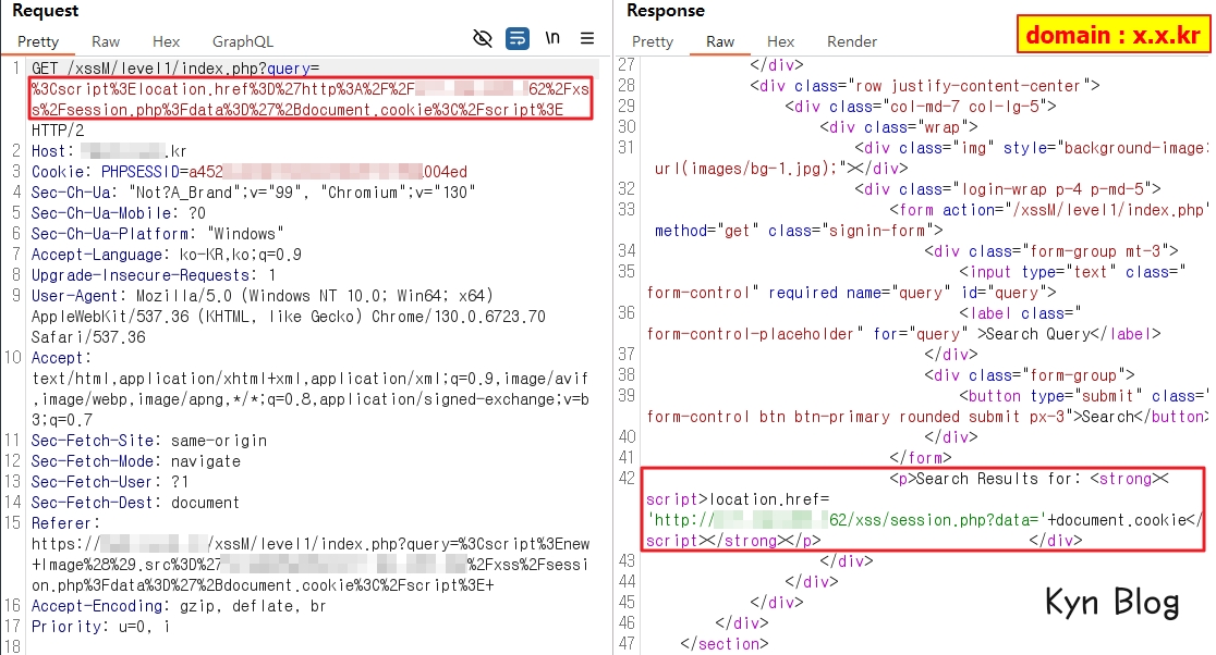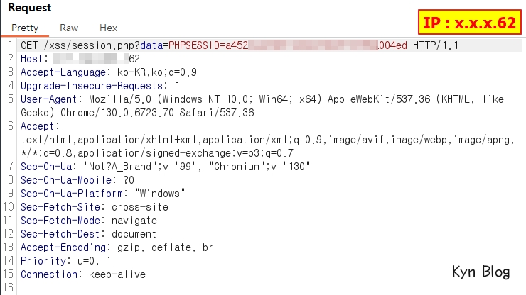 Step 4. 삽입한 스크립트가 실행되면서 "IP x.x.x.62" 에 세션정보를 전송함, 만약 공격자가 스크립트를 삽입한 검색 URL을 타 사용자가 실행할 수 있게 게시글 등으로 유도한다면 타 사용자 세션 정보를 탈취 할 수 있음