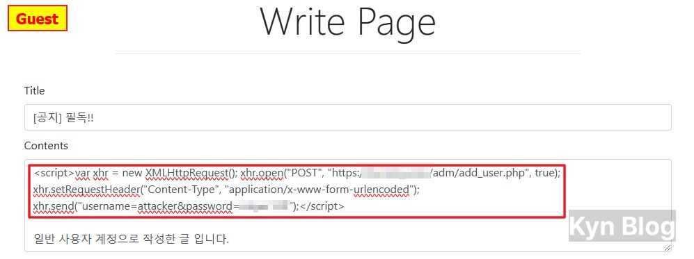 공격자가 게시글에 악성 스크립트를 삽입하고, 관리자가 이를 열람할 때 인증 정보가 탈취되는 시나리오입니다.