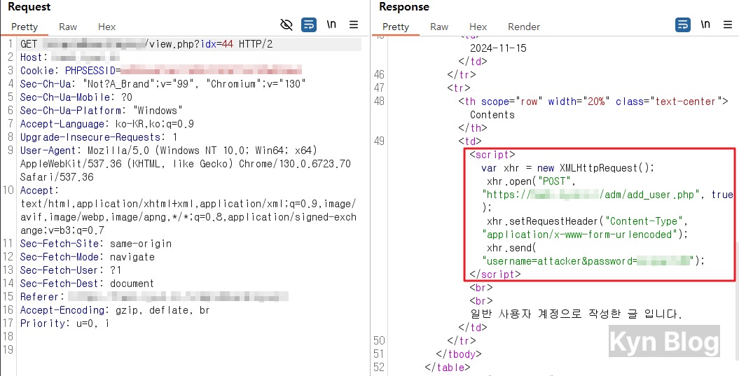 Step 3. 서버에서 응답하는 게시글 내용에서 스크립트가 삽입되어 있는 것 을 확인